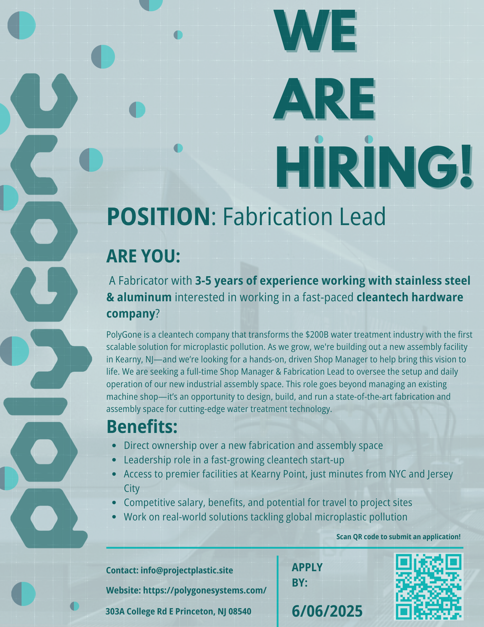 PolyGone is transforming water treatment with the world’s first scalable, affordable solutions for aquatic microplastic removal. Since our founding in 2022, we’ve advanced from lab development to launching the first municipal pilot for microplastic capture, and are now scaling commercial deployment of our PolyPod and PolyCartridge systems. As we grow, we're building out a new assembly facility in Kearny, NJ—and we’re looking for a hands-on, driven Shop Manager to help bring this vision to life.